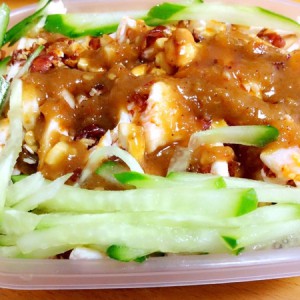 鸡肉白水煮熟切丝放在黄瓜上