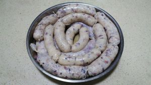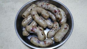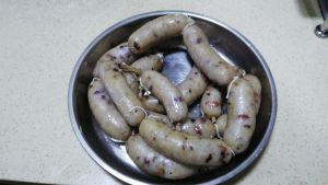 前面步骤都没拍,可惜了,没想到这么好吃。糯米泡8小时,花生泡2小时,香菇洗净泡半小时,肠衣洗净泡半小时。五花肉剁成沫,放生姜沫、盐、老抽、蚝油、胡椒粉、五香粉、白糖适量拌匀腌2小时。泡好的糯米放适量盐,香菇切碎后将所以材料放一起拌匀,泡香菇的水也放入。水平糯米就行。将泡好的肠衣套在灌肠器上,肠衣下面打个结就可以开始灌了。用勺子连糯米和水一起舀起灌入肠衣内,可以用筷子通通,可以快点。一根肠灌个八分满就行了。用手整均匀,再用绳子打结。