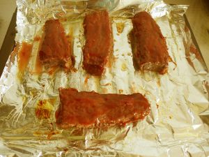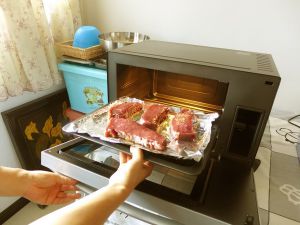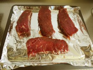 腌制好的牛肉摆放在烤盘中,剩下的汤汁料不要扔掉;