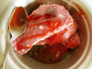 将叉烧酱、蜂蜜、蚝油倒入牛肉中,抓匀;