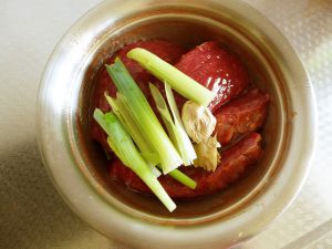 牛肉冲洗干净,擦干水分后,切成约2.5厘米厚的长条;