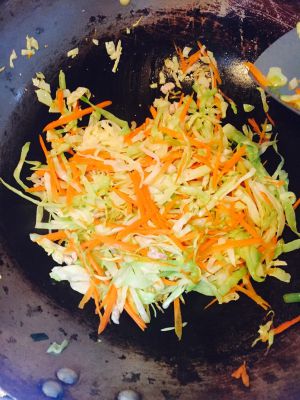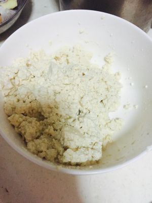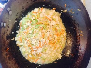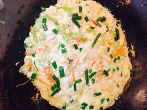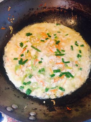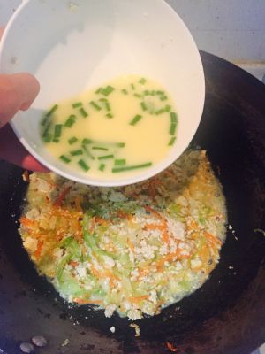 将豆腐翻炒一会儿,蛋液倒入锅中