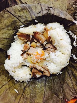 开始用荷叶包了,荷叶提早泡两小时左右,先放一层糯米饭再放爆炒过的鸡块,再放四份之一个咸蛋黄,最后放上一层糯米饭包好