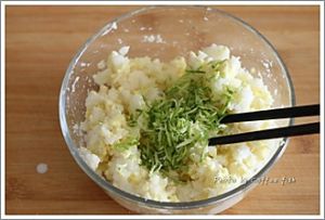 准备一个青柠檬.将青柠檬的皮刨丝,青柠檬丝放入装有山药泥和鸡蛋碎的大碗里.