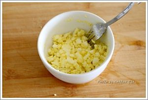 准备两个鸡蛋.煮熟,将煮熟的鸡蛋剥皮.用叉子按碎.