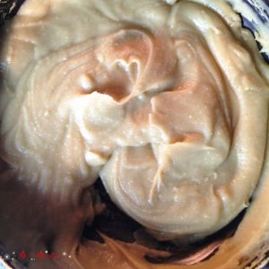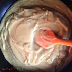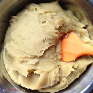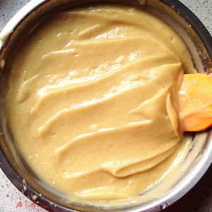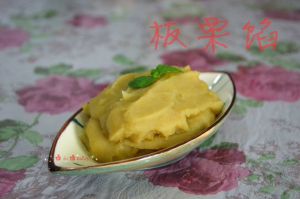 将板栗泥倒入不粘锅中,中小火不停翻炒,至水分略炒干,变得略粘稠。