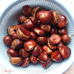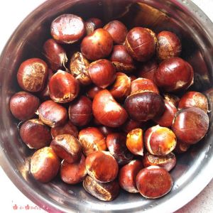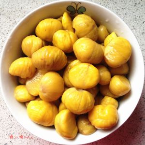 煮好后,趁热沿着裂口剥除壳和衣,取出板栗仁。(1.5斤的板栗我剥了1斤的肉;还有,一定要趁热剥,如果冷了,就稍微回烧下。)