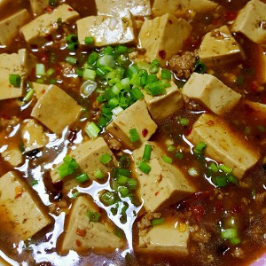 盛到盘里,撒上剩余的葱花装饰,一盘麻辣可口的麻婆豆腐就做好啦