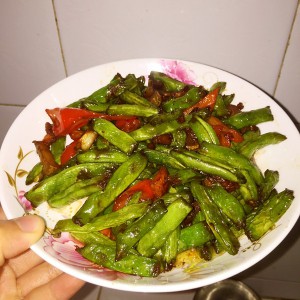 然后把切断的四季豆放下去一起爆炒,加蒜头,放盐下去,我还放了点生抽可有可无。用铲子一直翻炒。大概五分钟,然后看四季豆熟的程度。我放撒一点水继续炒到熟,不要太多,这水为了让盐入味。。继续翻炒到差不多熟