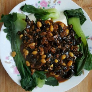 炒出香味后加水,然后加入木耳和黄豆,炒匀,盖盖焖几分钟。最后加入少许淀粉勾芡。好啦,香喷喷的浇汁就做好啦!