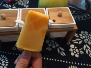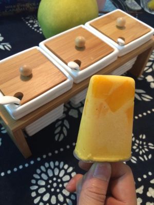 买了一箱芒果,比较大,半个果肉和牛奶打成奶昔,剩下半个果肉切粒,然后在棒冰模倒入芒果奶昔,和芒果肉粒。这个自己把握,想要多果肉就多放,不要放太满就好!