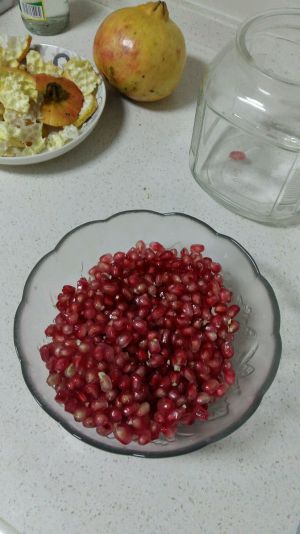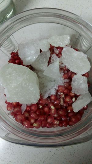 将石榴放入准备好的玻璃罐子中,上面放入冰糖,冰糖的量为石榴的1/4,可以根据个人喜好适当增减