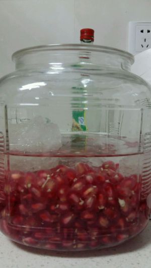 倒入白酒,加盖密封,十几二十天后就了开盖饮用了,颜色漂亮,口味还待定。传说石榴酒可以治疗咳嗽、哮喘,还有调理肠胃等。