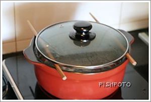 熬煮时用勺子搅拌几次,锅盖用筷子垫起以防溢出;