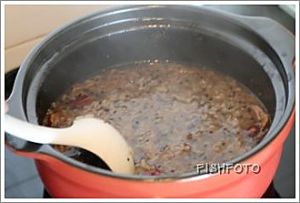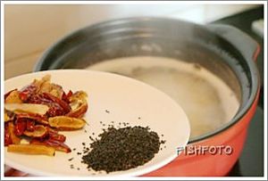 用大火煮沸后,加入红枣肉、黑芝麻,转小火慢慢熬煮;
