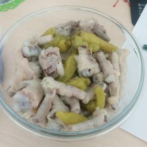由于忘记拍照片,只能口头说了。鸡爪清水洗几遍,热水下锅,加盐煮烂即可。泡椒兑水到自己可以承受的辣度,加葱、姜、蒜、桂皮、香叶、盐、糖少量(提示一下,糖是用来提鲜的,少放就好)煮开后两分钟关火,倒在容器里放凉。把煮好的鸡爪用凉水清洗几遍,与煮好的泡椒合在一起就OK了,放置一晚上第二天就可以吃了