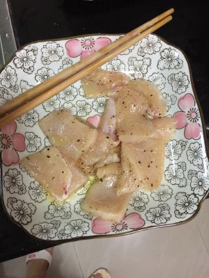 鸡胸肉切片 表面用厨房纸吸干水分 加海盐和黑胡椒碎腌制10分钟左右 淋少量橄榄油拌匀