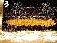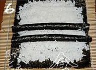 重新取一块紫菜,把用盐、醋、白糖拌匀的白米饭铺在上面,稍压实;
