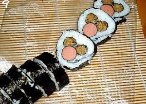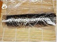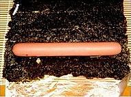 寿司帘上铺一块保鲜膜,上面铺一块紫菜,放上已经蒸熟的香肠;