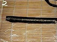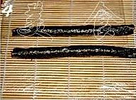 一次性手套上沾上凉开水,分次取酱油米饭在手中搓成条,然后摆放在紫菜上,拼成跟紫菜差不多长的长条;