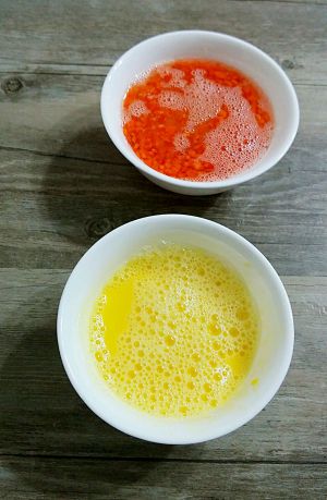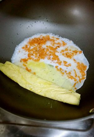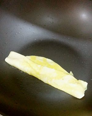 小火热油锅,不粘锅上抹层薄薄的油,蛋黄分2次倒入,第一次倒入打散的蛋黄一半,转动锅柄使蛋黄均摊成饼