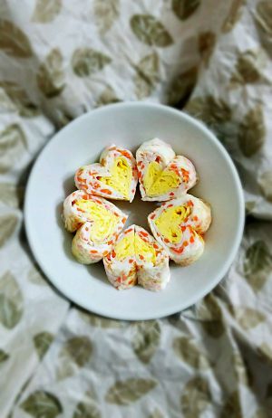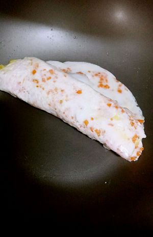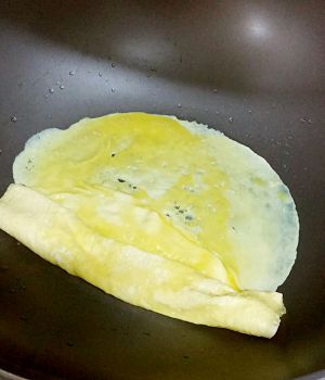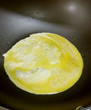 开始凝固了用铲卷在蛋饼的3分之2,倒入余下的蛋黄摊成圆