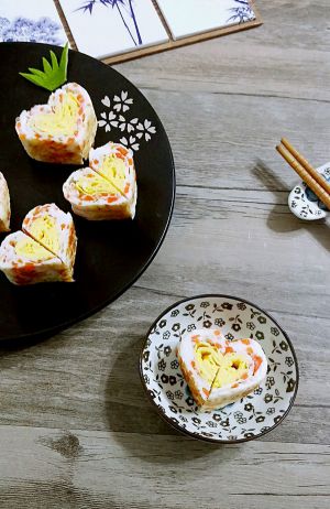 打侧放,每块以中心斜线切开,其中一块相反方向摆放就形成心形了。