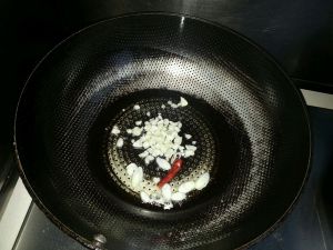 热锅热油,把葱,辣椒,蒜末少许放入锅中翻炒。