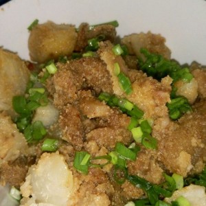 把腌好的肉和红薯裹上一层粉,我这个蒸肉粉是在超市买的(因为在家做不来蒸肉粉),所以买做好的蒸肉粉