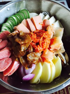 第三步 烧开水先放入辣椒酱 鸡精 盐 第四步 把其他蔬菜切片装锅 豆芽放在最下层 依次摆放 在把第三步放入第四步 撒上胡椒粉和煎五花肉剩下的油 小火慢煮 边煮边吃。