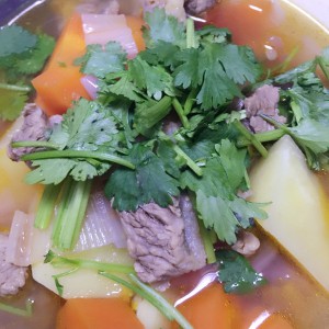 锅热后,加入一小块黄油,黄油化开之后加入洋葱炒香,再加入番茄翻炒,然后把所有材料加入锅中,加冷水,中小火慢炖3小时