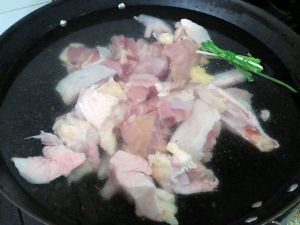 鸡肉冷水入锅,放入姜片,葱结,少许料酒煮开撇去浮沬捞出