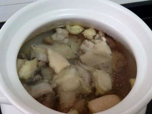 焯过水的鸡肉块转入砂锅煲中,注入足量多的热水,加盖煮开
