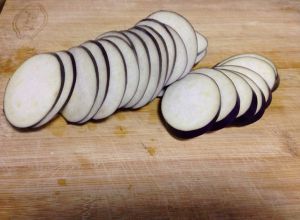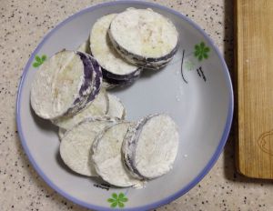 拿一片茄子,放上一些肉馅,摊均匀,再拿一片茄子扣上,稍微捏一下,肉馅具有粘合性,不会掉的。捏好的茄盒裹上一层面粉,放在盘中。