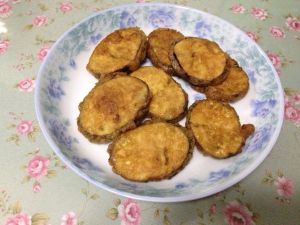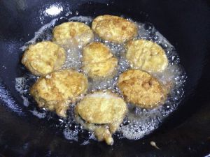 锅中倒入适量油,加热,在碗中打散两个鸡蛋,准备好蛋液,把裹好面粉的茄盒在蛋液中滚一下,沾满蛋液,此时油温热了,沾满蛋液的茄盒放在油锅里炸,注意调中小火、注意翻面炸,5-10分钟就炸好了!