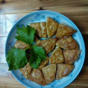 热锅冷油,用慢火煎至两面金黄,然后加适量的水,放少许酱油煮三分钟,可以装到盘里。
