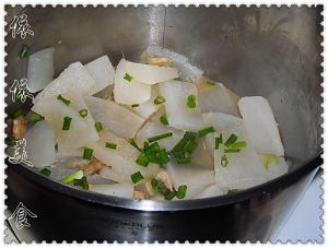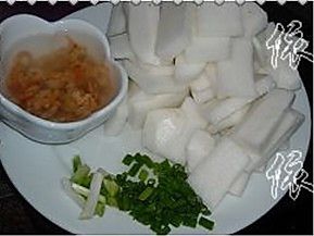 萝卜削皮,切块;虾米清洗干净后,用水泡软;葱分别切出葱花和葱白。