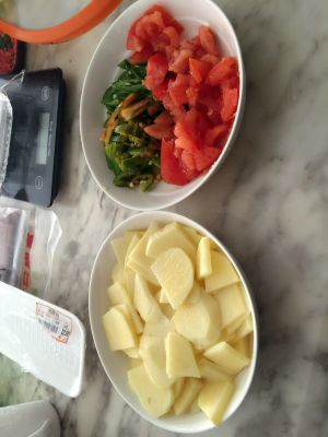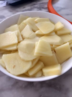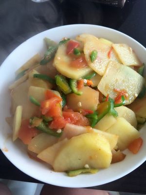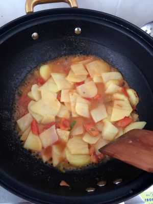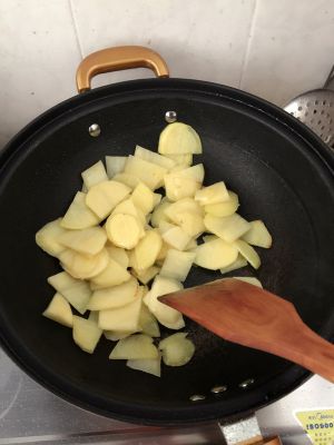 锅内放油,油热后放入土豆片,待土豆快熟的时候放入