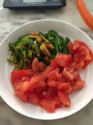锅内可以适量的放些水。等到西红柿差不多变成番茄酱的时候加入尖椒。准备起锅。