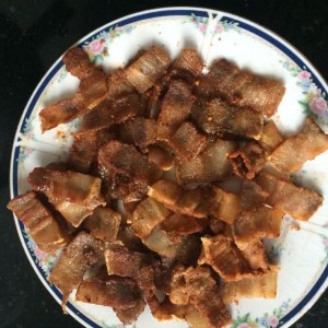 锅中刷少量薄油,五花肉生煎,撒盐,刷子刷烧烤调料,孜盐至两面均匀控油起锅