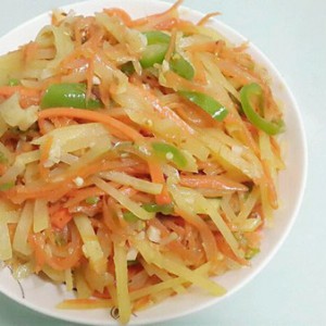 下土豆丝,土豆丝先切片,在切丝,然后放凉水里泡一下,沥干水分,下锅爆炒
