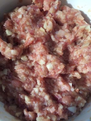 把切好的蒜末倒入肉末,撒点盐,鸡精,两勺料酒,一个鸡蛋。搅拌均匀,我用的是草鸡蛋,很小,一个大约40g左右~