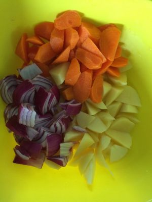 胡萝卜土豆滚到切块,块太小一会儿容易魂飞魄散,块太大又不太好煮透,大小自己掂量吧!洋葱切块…