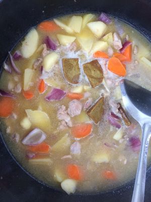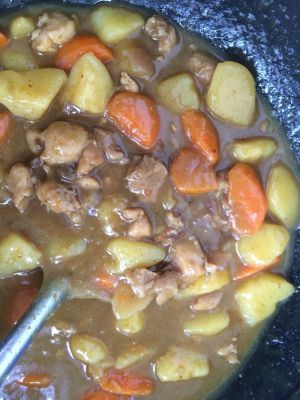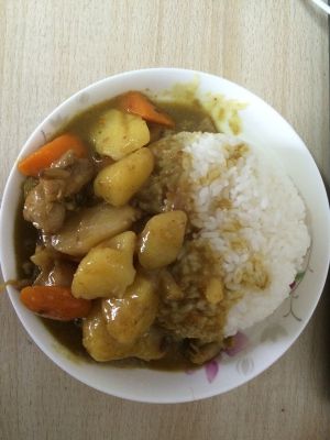 我喜欢多汁的于是多放了一些水,然后把咖哩块扔进去,让它融化,搅拌均匀!然后大火烧开,小火慢炖,并经常搅拌,咖喱容易粘锅,当然用不粘锅会好很多!