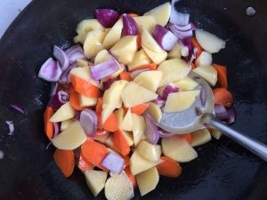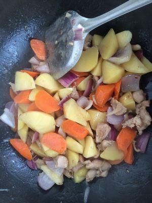 先用油把鸡肉炒下,盛出来,忘了拍,然后锅底放油继续炒胡萝卜洋葱和土豆,可以多炒一会儿,这样比较容易熟透,胡萝卜为脂溶性维生素必须用油炒才可以吸收里面的维生素B群哦!