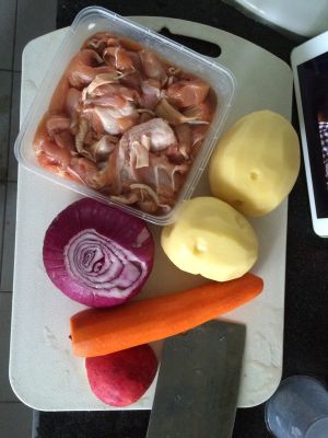 土豆胡萝卜洋葱洗净去皮,加了半个苹果提味,鸡腿肉去骨切小块,提前用料酒,盐,生抽,淀粉少许腌制30分钟左右!