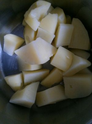 将土豆去皮,切块儿,放入锅中,加水滚煮15分钟到筷子可以轻易穿透