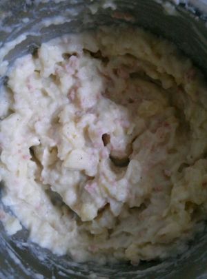 捞出,加牛奶压成泥状,再加入香肠碎末,盐,黑胡椒后,搅拌均匀