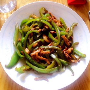 锅里热油,下青椒翻炒。倒入酱油接着翻炒