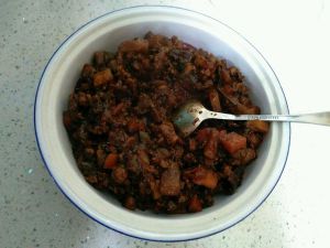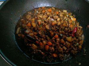 倒入已经翻炒过的肉末,放豆瓣酱两大勺、麻辣鲜一勺,糖四小勺,生抽少许,炒一会儿倒入老抽一起翻炒,看入色差不多了放适量水,倒入茴香八角桂皮干辣椒芝麻等香料,拌匀,大火煮到沸腾,关小火,盖锅盖慢慢熬煮。